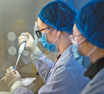 重慶市長壽區疾病預防控制中心“90后”女檢測員文纖纖(左)、楊涵與病毒“零距離”對峙,持續戰斗在新型冠狀病毒PCR檢測室,為患者的診治爭取了寶貴時間。圖為兩位檢測員在提取化驗結果。樊 強攝(人民視覺)