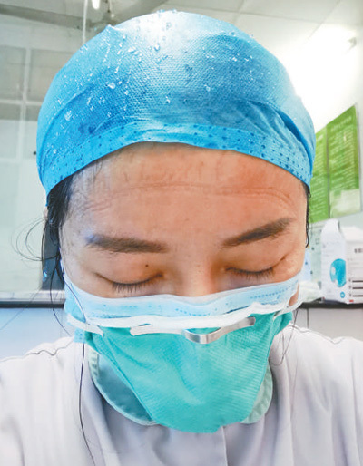 武警湖北總隊醫院衛生防疫科“90后”護士肖瑞,堅守在防疫一線已有20多天。圖為忙碌了一天的肖瑞,走出病房脫下隔離衣,豆大的汗珠掛滿一次性工作帽,額頭上的勒痕清晰可見。吳 君 王云可攝影報道