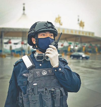 四川成都市青羊區公安分局民警楊桐今年28歲,新婚不久的他投入防疫一線,在高速公路收費站執勤,每天平均盤查1000余臺車輛,為2600余人測量體溫。圖為2月12日,楊桐在崗位上通過對講機與同事溝通工作。本報記者 王明峰攝