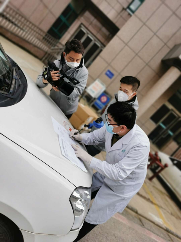 中央電視臺(tái)國(guó)際頻道跟拍志愿者給四醫(yī)院和兒童醫(yī)院分配物資,醫(yī)生正在簽字確認(rèn)。