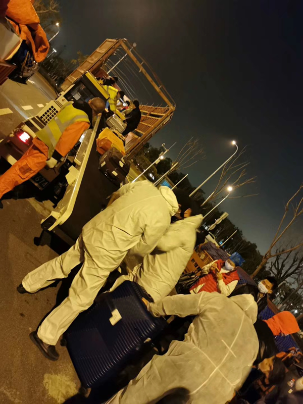 2月13日,(武漢)天河機(jī)場(chǎng)到了七架飛機(jī),有1600個(gè)醫(yī)護(hù)人員,從不同的城市過(guò)來(lái),飯都沒(méi)吃,站在那里冷颼颼的。他們有很多行李,機(jī)場(chǎng)的人手不夠,我們就過(guò)來(lái)幫忙把這些行李運(yùn)送到貨車上,然后再送到他們相應(yīng)的酒店,酒店會(huì)有志愿者幫忙卸行李。