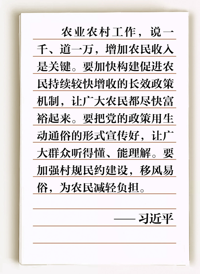 “致富路越走越寬,日子越過越紅火,全靠黨的政策好。總書記高興地說,農業農村工作,說一千、道一萬,增加農民收入是關鍵。”