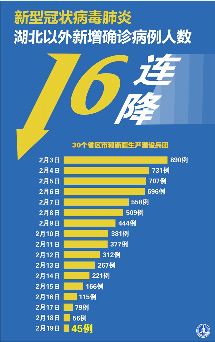 截至2月19日24時(shí),據(jù)31個(gè)?。ㄗ灾螀^(qū)、直轄市)和新疆生產(chǎn)建設(shè)兵團(tuán)報(bào)告,現(xiàn)有確診病例56303例(其中重癥病例11864例),累計(jì)治愈出院病例16155例,累計(jì)死亡病例2118例,累計(jì)報(bào)告確診病例74576例(江西、河南、云南省各核減1例),現(xiàn)有疑似病例4922例。累計(jì)追蹤到密切接觸者589163人,尚在醫(yī)學(xué)觀察的密切接觸者126363人。