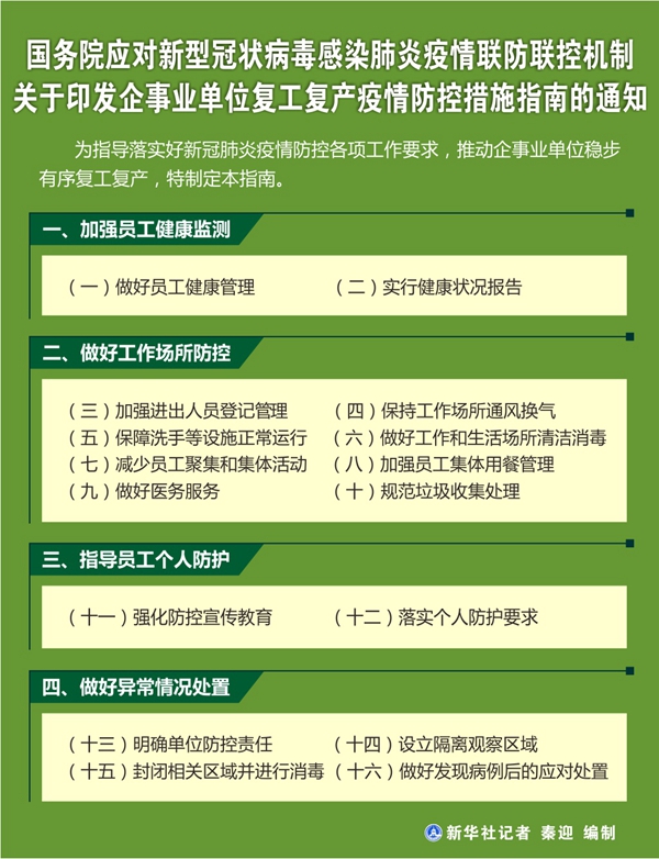 新華社北京2月22日電? 2月21日,國(guó)務(wù)院聯(lián)防聯(lián)控機(jī)制就指導(dǎo)落實(shí)新冠肺炎疫情防控各項(xiàng)工作要求,推動(dòng)企事業(yè)單位穩(wěn)步有序復(fù)工復(fù)產(chǎn),印發(fā)《企事業(yè)單位復(fù)工復(fù)產(chǎn)疫情防控措施指南》。