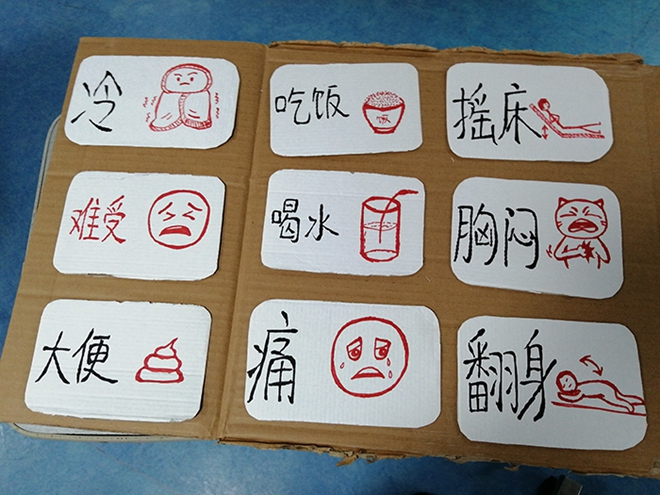 來自江西省人民醫院的護士陳鈺浠就地取材,利用廢紙板和小卡片制作“圖解護理需求表”,把患者最常用的十幾個需求變成圖標,解決了重癥患者不方便言語和醫護人員聽不懂方言的困難。