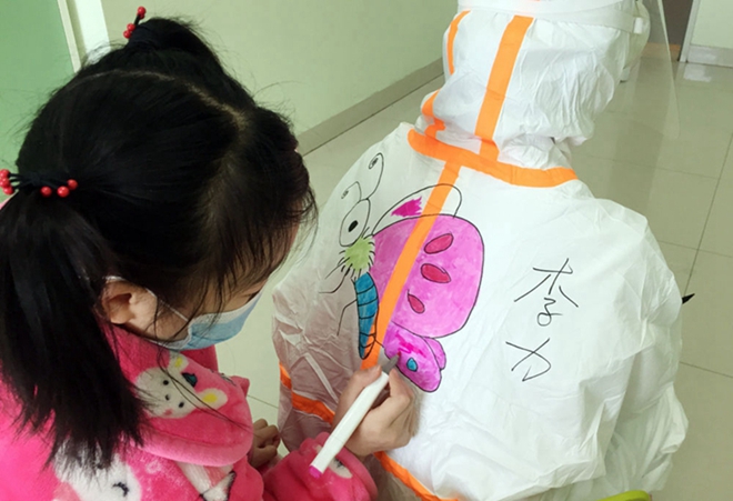 在武漢兒童醫院新冠肺炎患兒隔離病房里,平時喜歡畫畫的護士王佳想到一個妙招——在防護服上畫卡通畫,再讓小朋友涂色,幫助他們減輕恐懼。