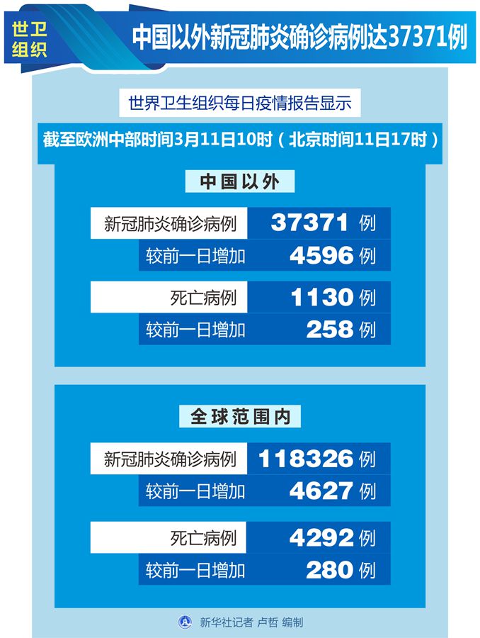 世衛組織每日疫情報告顯示,截至歐洲中部時間11日10時(北京時間11日17時),中國以外新冠肺炎確診病例較前一日增加4596例,達到37371例;中國以外死亡病例較前一日增加258例,達到1130例。