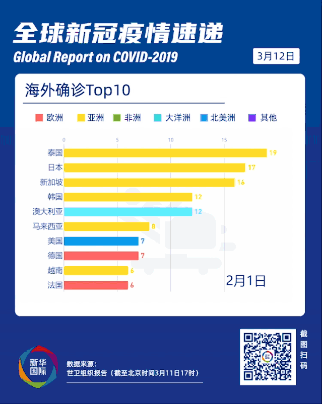 意大利全國范圍實施“封城”;法國、西班牙確診病例突破兩千;伊朗啟動國家動員計劃……世衛組織報告顯示,截至北京時間11日17時,中國以外有113個國家和地區報告確診病例37371例,死亡1130例。