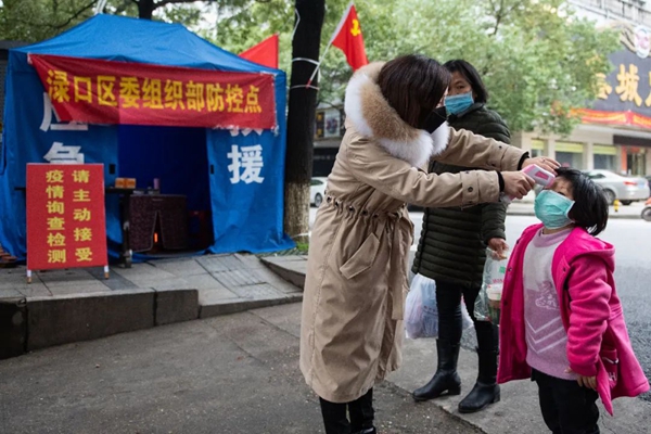 3月4日,在湖南省株洲市淥口區一住宅小區前的值守點,工作人員為居民測量體溫。新華社發陳思汗攝