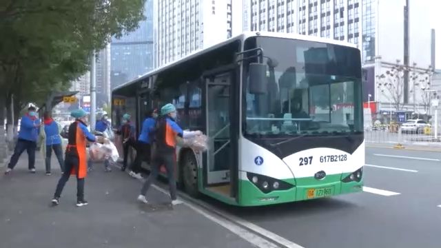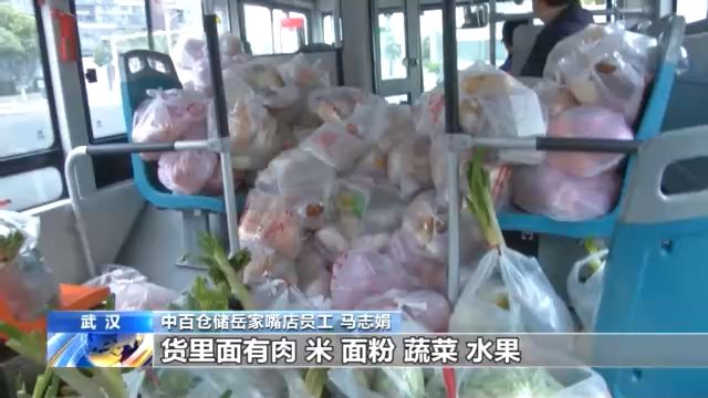 十點整,運送1500包愛心菜和500多包其它生活物資的專車來了:一輛297路公交車。為了提高運輸效率,武漢市公交集團承接了全市社區團購的集中配送任務。幾十名超市員工組成“人力傳送帶”把物資送上車。很快,公交車出發了。