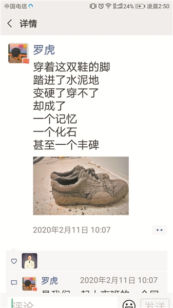 第二天,同為重癥醫(yī)學一科軍醫(yī)的羅虎聽聞戰(zhàn)友的“趣聞”后,專門為那雙已經(jīng)風干的42碼迷彩鞋拍了一張照片,還配詩一首。