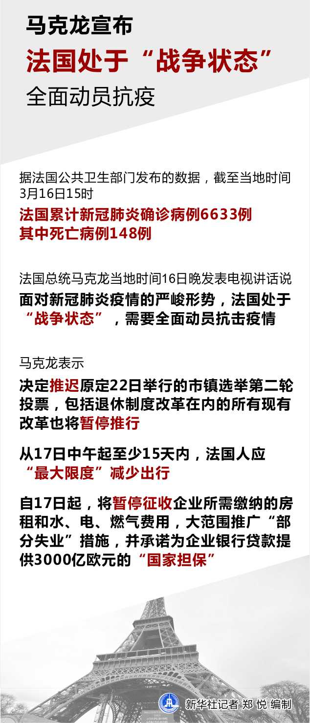 新華社巴黎3月16日電(記者徐永春 唐霽 陳晨)法國總統馬克龍16日晚發表電視講話說,面對新冠肺炎疫情的嚴峻形勢,法國處于“戰爭狀態”,需要全面動員抗擊疫情。