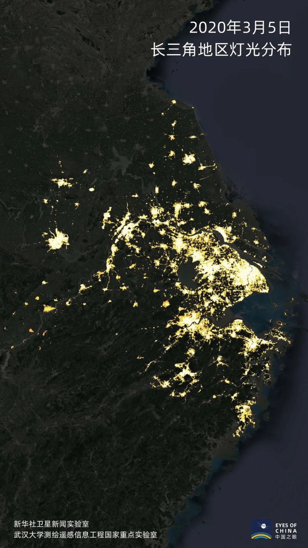 這是長三角地區3月5日夜間燈光分布情況。
