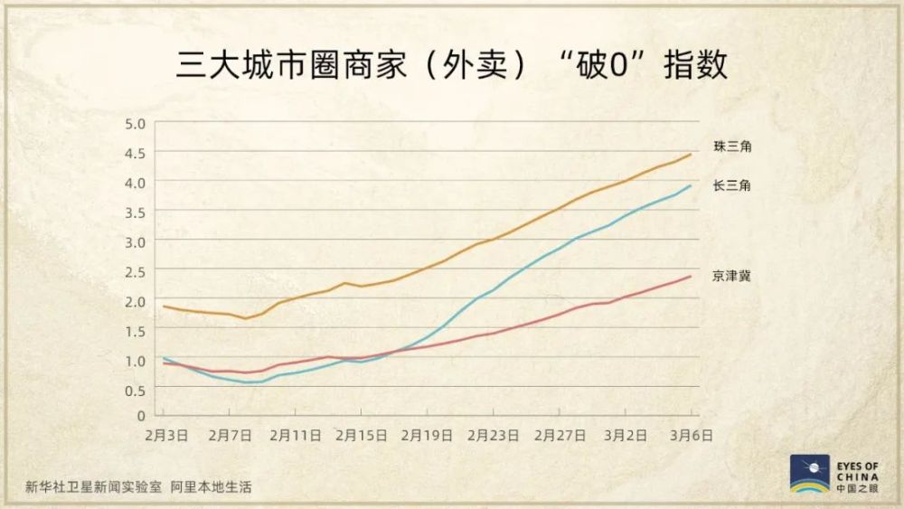 “破0”指數,是根據商家恢復營業獲得首筆收入、復工后的持續營業時間等計算得出,這兩張圖呈現出,在三大城市圈,復工復產并獲得收入的商家不斷增多。