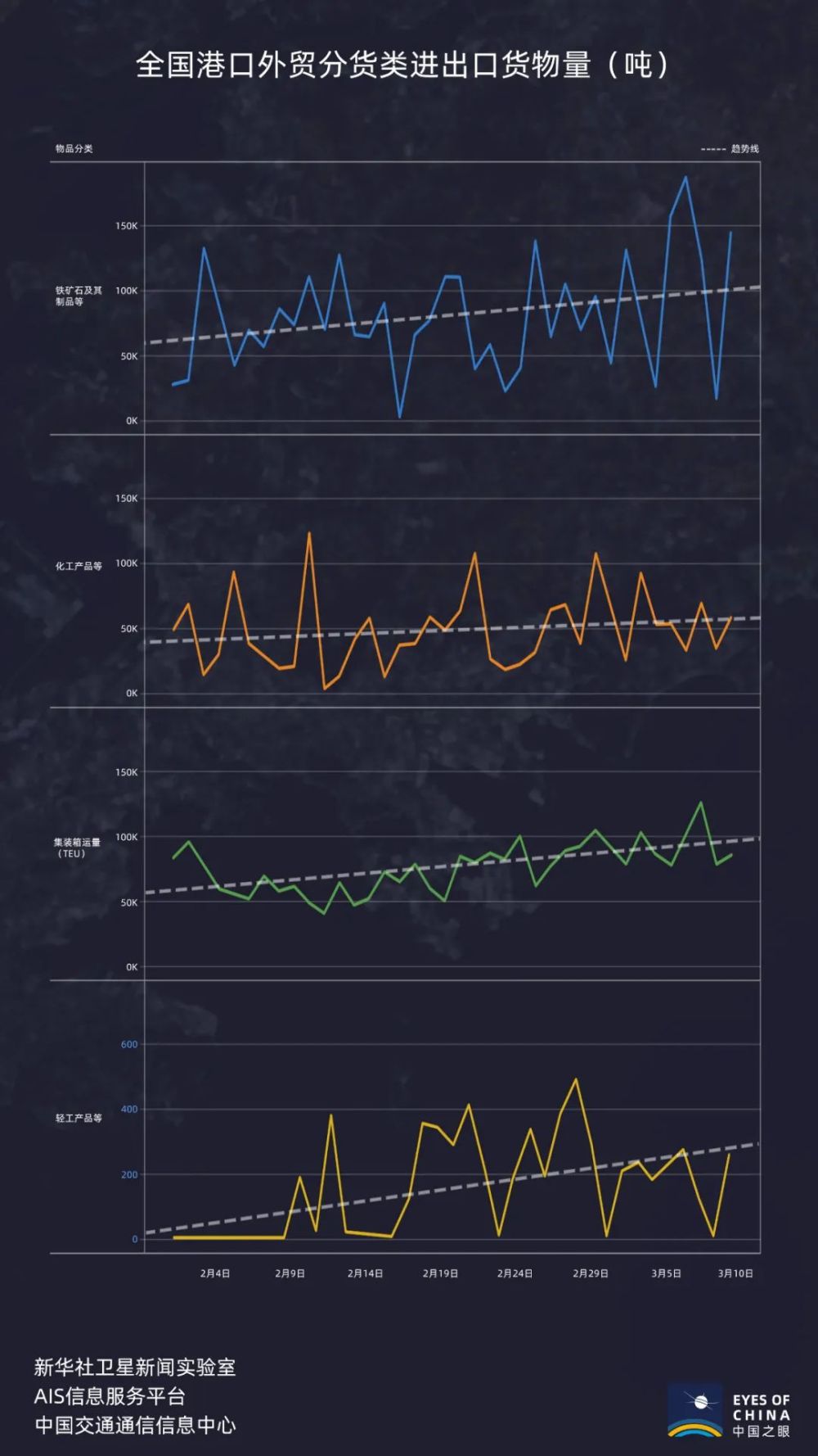 中國主要出口貨物種類的總量大多在回升,鐵礦石及其制品、化工產品以及輕工產品等的進出口量增加更為明顯。