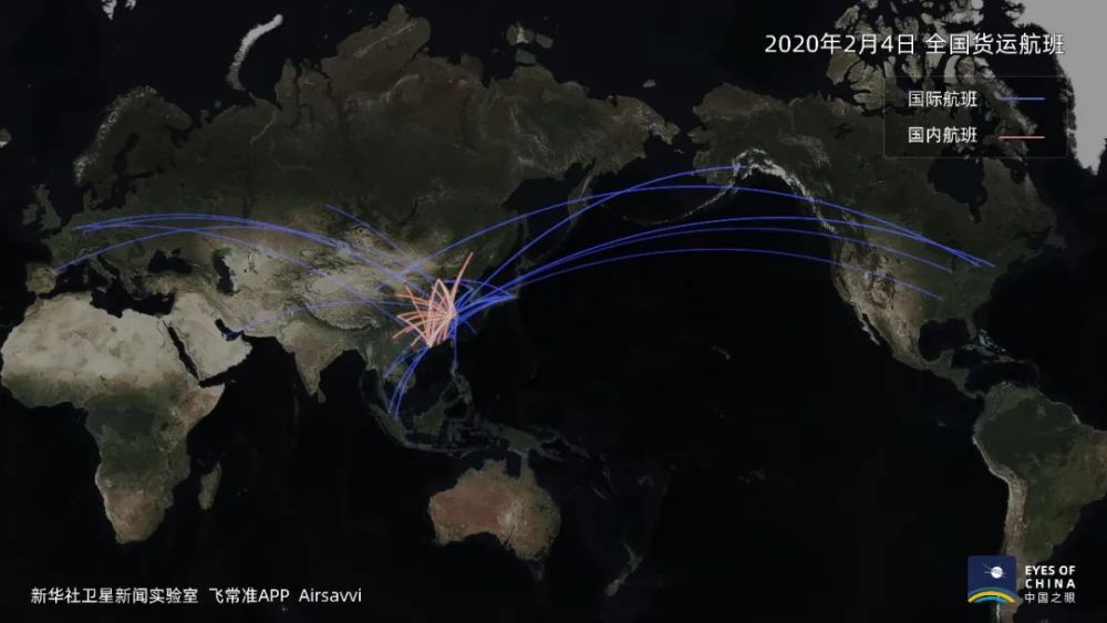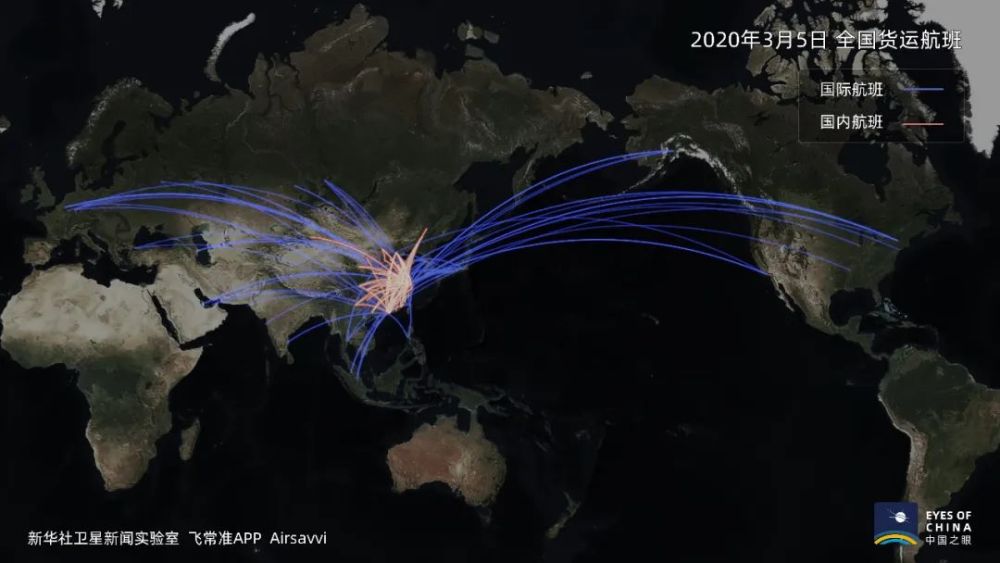 1個月內,中國國內和直飛世界各地的貨運航班快速增多,原有航線航班數也有增加,標示航線的橘色、藍色線條也就更粗。