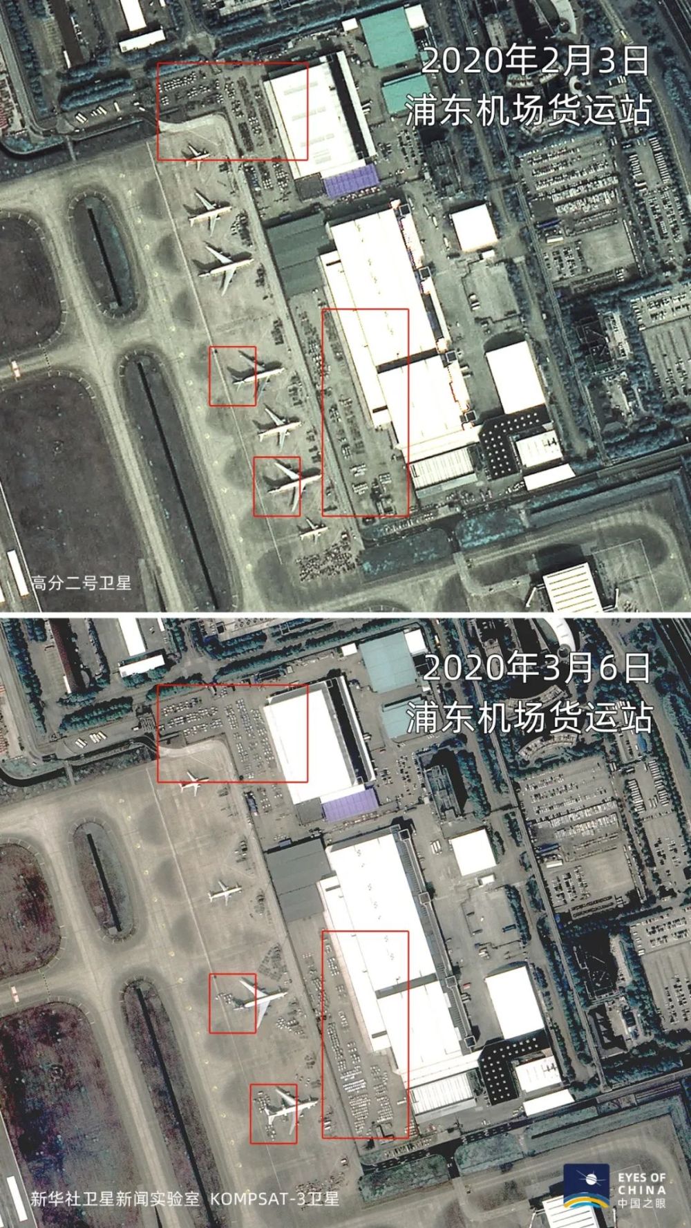 浦東機場貨運站,2月3日多架停放在地面的飛機裝卸貨物跡象不明顯。3月6日,地面停放飛機數量減少,且多在進行裝卸作業,堆放的貨物也大大增多。