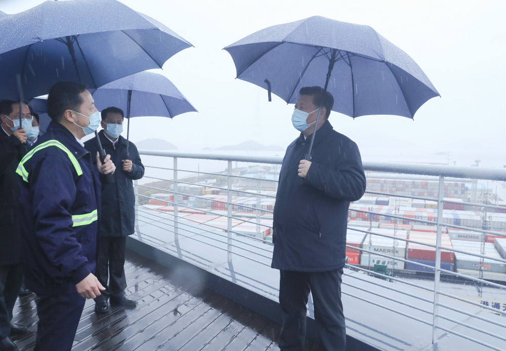 從新華社發出的現場照片看,總書記在寧波舟山港穿山港區碼頭上沒有佩戴口罩。↓↓↓