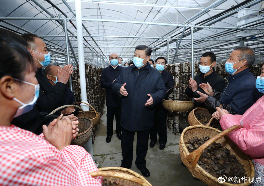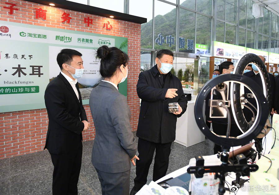 正在陜西考察的習近平總書記20日下午來到柞水縣小嶺鎮金米村。金米村地處秦嶺深處,近年來依靠發展木耳等產業擺脫了貧困。村培訓中心,幾位村民正在做網上直播賣貨的準備工作,總書記走到直播平臺前,同他們親切交談起來。他表示,電商作為新興業態,既可以推銷農副產品、幫助群眾脫貧致富,又可以推動鄉村振興,是大有可為的。(文字記者:張曉松 攝影記者:鞠鵬、謝環馳、燕雁、翟健嵐)