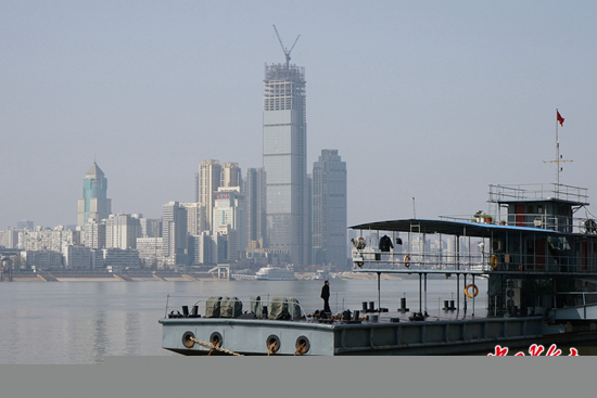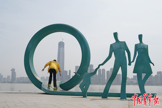 武漢解封之后,一位武漢市民在江灘玩耍。