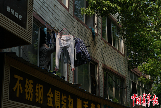 封城期間,一位社區居民直接將衣服晾曬在窗外的繩子上。