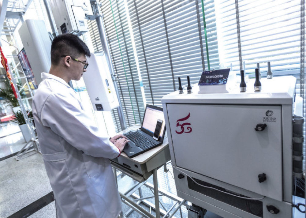 2018年2月5日,工作人員在湖北首個室外 5G試驗基站上測試帶寬 ( 熊琦/攝 )
