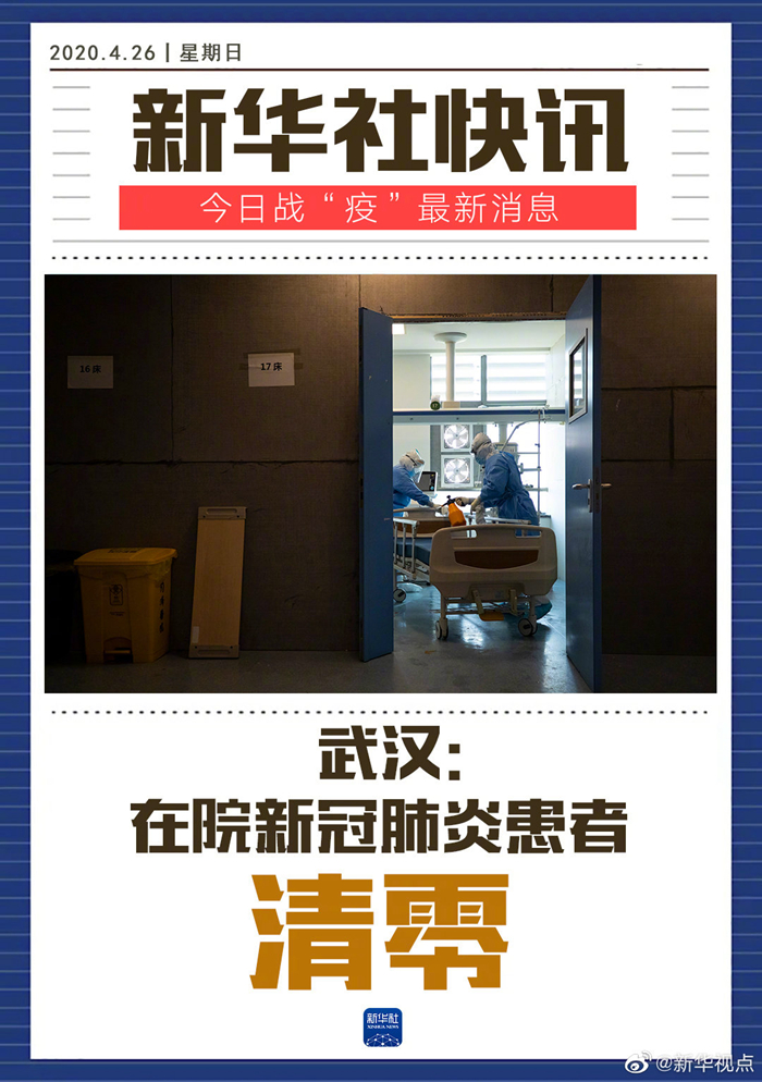 國(guó)家衛(wèi)健委新聞發(fā)言人米鋒26日在國(guó)務(wù)院聯(lián)防聯(lián)控機(jī)制新聞發(fā)布會(huì)上說(shuō),至26日,武漢在院新冠肺炎患者清零。