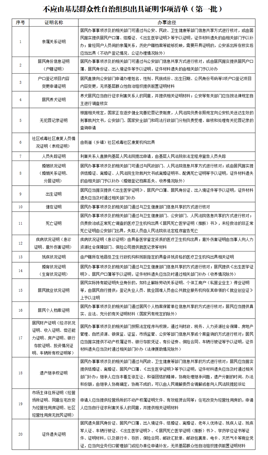 根據(jù)中共中央、國(guó)務(wù)院關(guān)于減證便民、優(yōu)化服務(wù)的部署要求,凡是沒(méi)有法律法規(guī)依據(jù)或未經(jīng)國(guó)務(wù)院批準(zhǔn)列入保留證明事項(xiàng)清單的證明事項(xiàng),基層群眾性自治組織不予出具。對(duì)雖有法律法規(guī)依據(jù)但已經(jīng)不符合當(dāng)前經(jīng)濟(jì)社會(huì)發(fā)展實(shí)際的或基層群眾性自治組織沒(méi)有能力核實(shí)的,有關(guān)部門(mén)要在廣泛征求意見(jiàn)、充分調(diào)研論證的基礎(chǔ)上按程序提請(qǐng)修改法律法規(guī)規(guī)定,明確基層群眾性自治組織不再出具。根據(jù)國(guó)家有關(guān)法律法規(guī)規(guī)定,適時(shí)分批明確不應(yīng)由基層群眾性自治組織出具證明的事項(xiàng)。現(xiàn)明確《不應(yīng)由基層群眾性自治組織出具證明事項(xiàng)清單(第一批)》(見(jiàn)附件)。