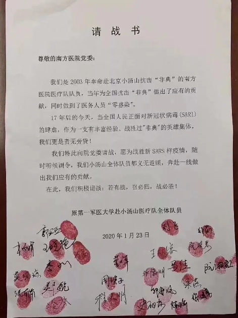 △1月23日,曾參加原第一軍醫大學赴小湯山醫療隊的南方醫院24名醫護人員寫下請戰書,主動要求赴一線工作。