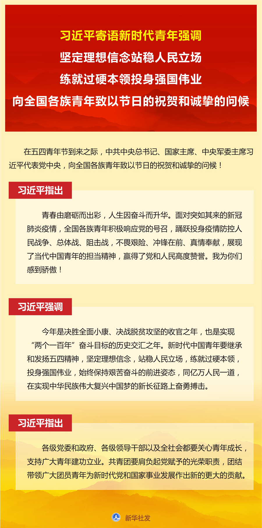 習近平寄語新時代青年強調 堅定理想信念站穩人民立場 練就過硬本領投身強國偉業 向全國各族青年致以節日的祝賀和誠摯的問候