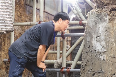 這張照片拍攝于2020年4月26日??脊抨爢T拍到了他們領隊崔勇做現場評估的場景。在沉船的外圍,已經進展到發掘外側反斜面位置,此時支護要預防船向下和向外的移位。支架太疏帶來風險,太密則會影響發掘。 鄧嘉韶攝