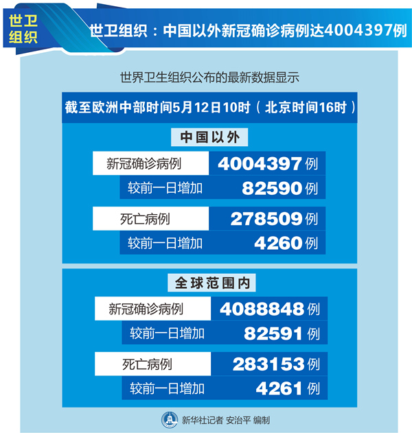 新華社日內(nèi)瓦5月12日電(記者劉曲)世界衛(wèi)生組織12日公布的最新數(shù)據(jù)顯示,中國以外新冠確診病例達到4004397例。