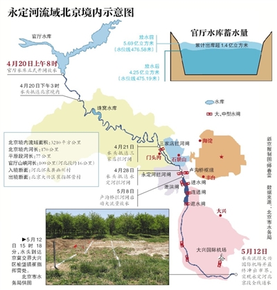 4月20日8時,官廳水庫開閘放水,截至5月12日15時18分,官廳水庫水位已由476.58米(蓄水量5.69億立方米)降至475.19米(蓄水量4.25億立方米),累計出庫超1.4億立方米。