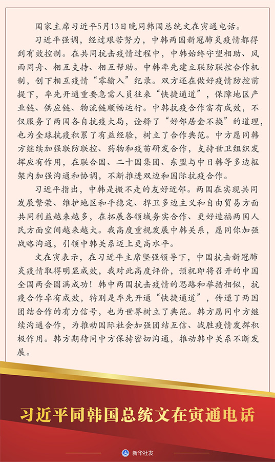 新華社北京5月13日電 國(guó)家主席習(xí)近平5月13日晚同韓國(guó)總統(tǒng)文在寅通電話。