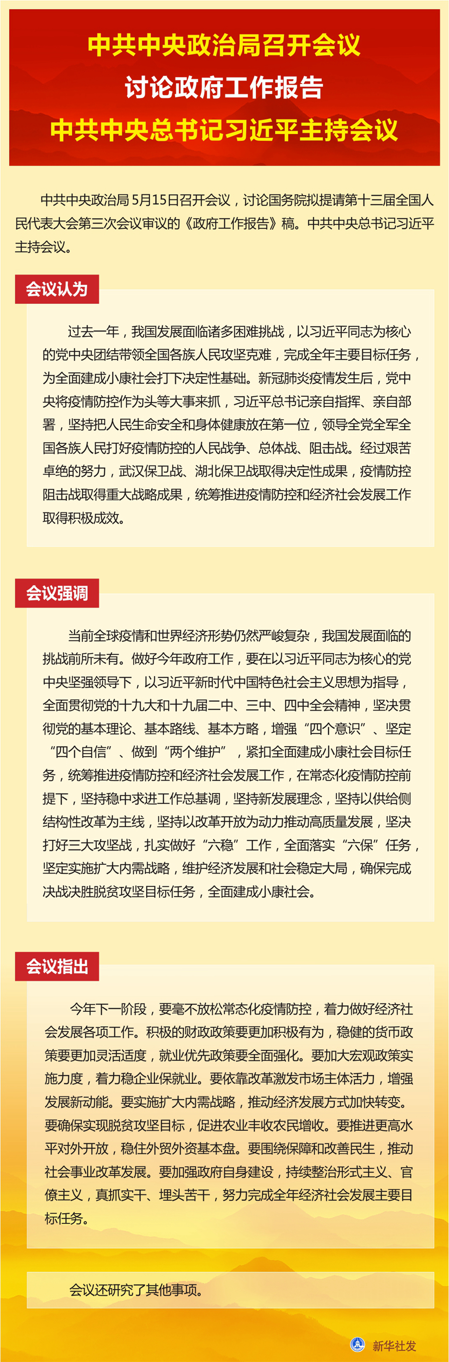 新華社北京5月15日電 中共中央政治局5月15日召開會議,討論國務院擬提請第十三屆全國人民代表大會第三次會議審議的《政府工作報告》稿。中共中央總書記習近平主持會議。