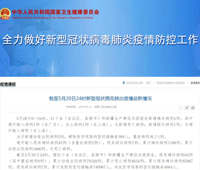截至5月20日24時新型冠狀病毒肺炎疫情最新情況