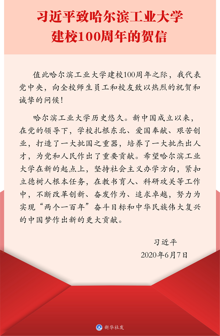 新華社北京6月7日電 中共中央總書記、國家主席、中央軍委主席習近平7日致信祝賀哈爾濱工業大學建校100周年,向全校師生員工和校友致以熱烈的祝賀和誠摯的問候。