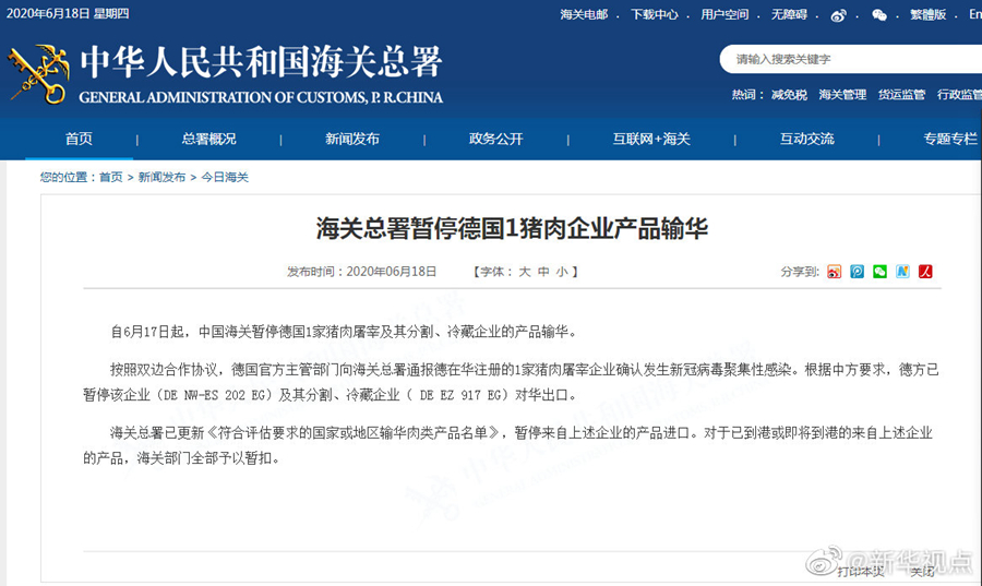 海關總署18日發(fā)布公告,自6月17日起,中國海關暫停德國一家豬肉屠宰及其分割、冷藏企業(yè)的產品輸華。按照雙邊合作協(xié)議,德國官方主管部門向海關總署通報德在華注冊的一家豬肉屠宰企業(yè)確認發(fā)生新冠病毒聚集性感染。根據中方要求,德方已暫停該企業(yè)及其分割、冷藏企業(yè)對華出口。海關總署已更新《符合評估要求的國家或地區(qū)輸華肉類產品名單》,暫停來自上述企業(yè)的產品進口。對于已到港或即將到港的來自上述企業(yè)的產品,海關部門全部予以暫扣。(記者劉紅霞)