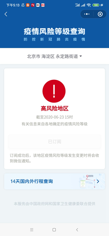 北京又增一個高風(fēng)險地區(qū)! 記者從國務(wù)院客戶端小程序“疫情風(fēng)險等級查詢”上了解到,截至6月23日15時,北京市海淀區(qū)永定路街道由中風(fēng)險調(diào)整為高風(fēng)險。