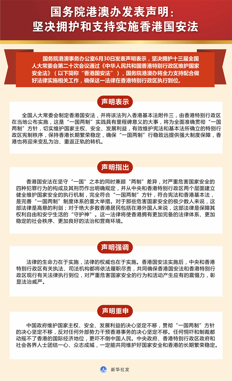 國務院港澳辦發表聲明:堅決擁護和支持實施香港國安法-新華網