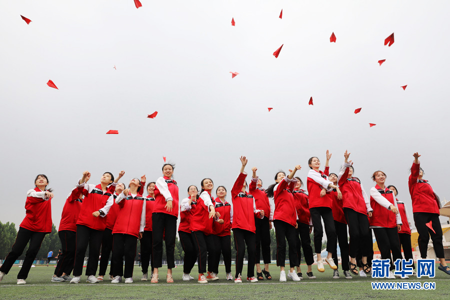 2020年7月3日,河南省溫縣一中高三學生在學校操場上做減壓游戲。 2020年全國高考即將拉開帷幕,同學們從容應對,以良好的狀態迎接高考的到來。 新華社發(徐宏星 攝)