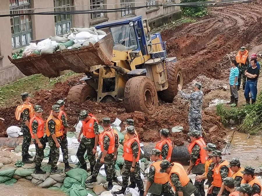 很快,卡車運來土方,鏟車、挖掘機開路,眾人分工,向險而行。