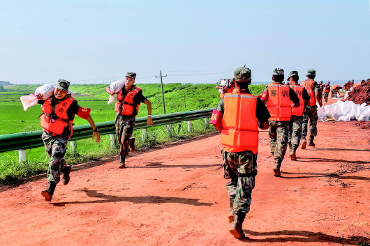 鄱陽(yáng)鎮(zhèn)問桂道圩堤發(fā)生漫決后,近萬名群眾被緊急轉(zhuǎn)移,中國(guó)安能第二工程局迅速調(diào)集400余名搶險(xiǎn)人員、52臺(tái)(套)裝備星夜馳援,并與陸續(xù)趕來增援的火箭軍、武警和預(yù)備役部隊(duì),會(huì)戰(zhàn)于鄱湖之濱。