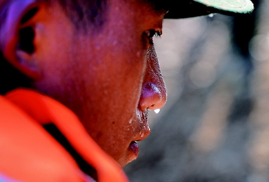 武警江西總隊(duì)上饒支隊(duì)的一名戰(zhàn)士臉上流下的汗水(7月14日攝)。新華社記者萬象攝