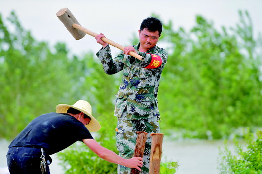 7月12日,江洲鎮(zhèn)柳州村的村支書洪棉雪(右)和村民一起打樁,加固堤壩。新華社記者彭昭之?dāng)z