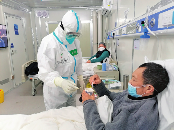3月18日,武漢雷神山醫院,新冠肺炎患者在病房服用中藥湯藥治療