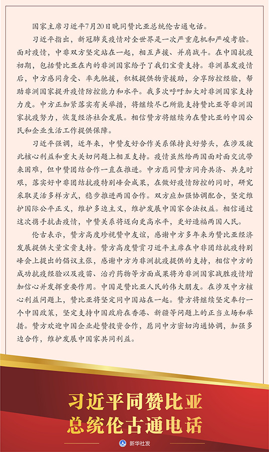 習(xí)近平強(qiáng)調(diào),近年來(lái),中贊友好合作關(guān)系保持良好勢(shì)頭,在涉及彼此核心利益和重大關(guān)切問(wèn)題上相互支持。疫情雖然給兩國(guó)面對(duì)面交流帶來(lái)困難,但中贊團(tuán)結(jié)合作一直在推進(jìn)。中方愿同贊方同舟共濟(jì)、共克時(shí)艱,落實(shí)好中非團(tuán)結(jié)抗疫特別峰會(huì)成果,在做好疫情防控的同時(shí),研究采取靈活多樣方式,穩(wěn)步推進(jìn)兩國(guó)合作。雙方應(yīng)加強(qiáng)協(xié)調(diào)配合,堅(jiān)定維護(hù)國(guó)際公平正義,維護(hù)多邊主義,維護(hù)發(fā)展中國(guó)家合法權(quán)益。相信通過(guò)這次攜手抗擊疫情,中贊關(guān)系將邁向更高水平,更好造福兩國(guó)人民。