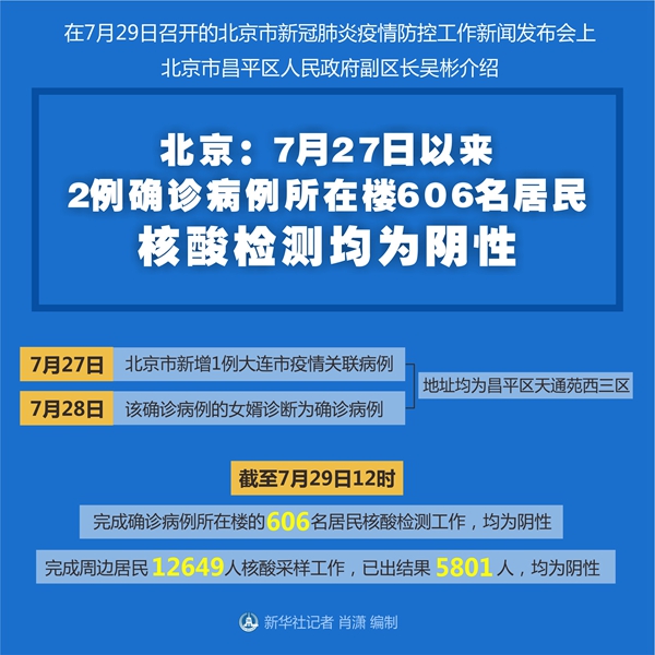 新華社北京7月29日電(記者陳旭)在29日召開的北京市新冠肺炎疫情防控工作新聞發(fā)布會(huì)上,北京市昌平區(qū)人民政府副區(qū)長(zhǎng)吳彬介紹,27日以來(lái)2例大連市疫情關(guān)聯(lián)確診病例所在樓606名居民核酸檢測(cè)工作已完成,均為陰性。周邊居民12649人核酸采樣工作已出結(jié)果5801人,均為陰性。