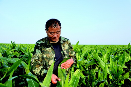 ▲陳華在黑龍江省綏棱縣靠山村玉米地里查看玉米長勢(7月10日攝)。本報記者齊泓鑫攝