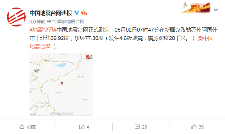 中國地震臺網正式測定:08月02日07時47分在新疆克孜勒蘇州阿圖什市(北緯39.92度,東經77.30度)發生4.6級地震,震源深度20千米。